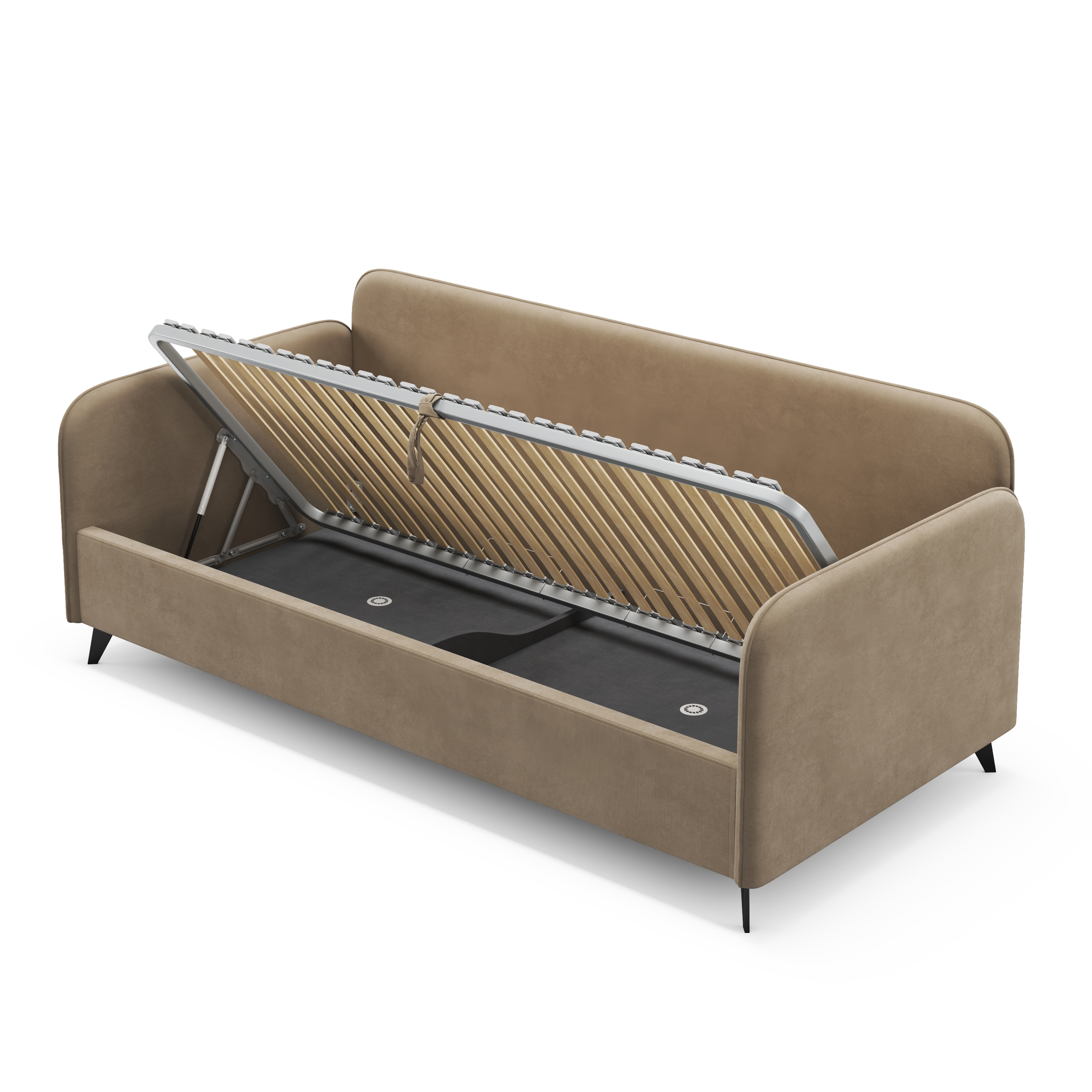 Односпальная кровать LORENS TWIN с подъемным механизмом и ножками – современная и функциональная модель, сочетающая в себе комфорт, удобство и визуальную легкость. Подъемное спальное место обеспечивает доступ к ящику для хранения вещей, а ножки делают конструкцию стильной и воздушной.