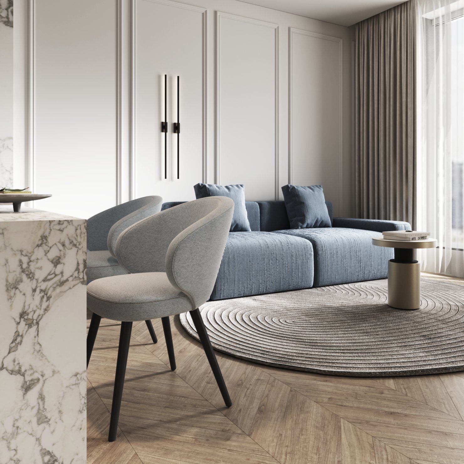 Выверенный шарм, который невозможно не заметить в деликатных и утонченных деталях фактуры. Диалог между оттенками нитей основы и петлями букле метким акцентом оживляет текстуру мебельных форм. А размеренный ритмичный шаг завитков наделяет образ мебели сдержанностью и лаконичностью, но в то же время дарит мягкость и комфорт.